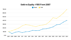 Gold ETFs have also shown impressive performance. In 2024, gold enjoyed a 27% return, significantly outpacing equity indices. This means a gold ETF would have jumped by 27%, whereas the Nifty 50 and S&P 500 returned much less in that period. Over the past decade, gold’s performance has been on par with equities: one analysis found a top gold ETF gave about 13.46% annualized over 10 years (₹1 L → ₹3.53 L), almost the same as the Nifty’s 13.62%.